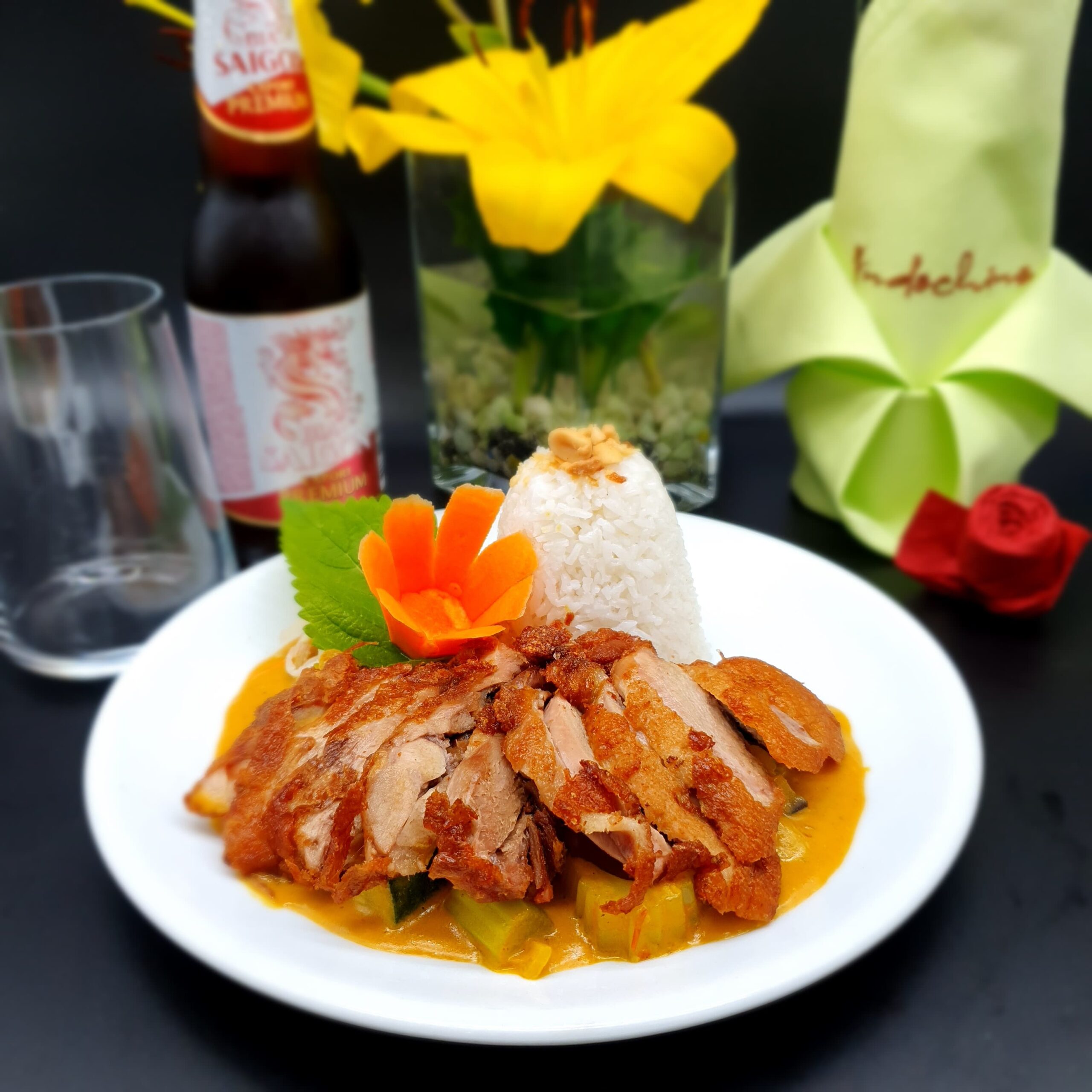 Gegrillte Enten in rotem Thai-Curry mit Kokosmilch, saisonalem Gemüse & Jasminreis – ein exotischer Genuss